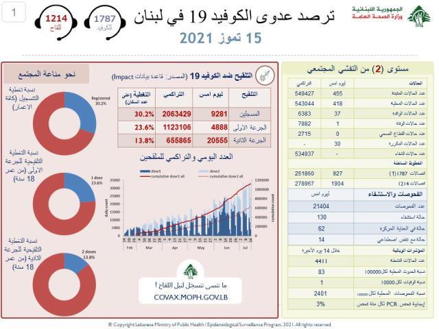 اصدرت وزارة الصحة العامة تقريرها اليومي حول مستجدات فيروس كورونتا، واعلنت فيه تسجيل 455 اصابة جديدة بالفيروس وحالة وفاة واحدة.