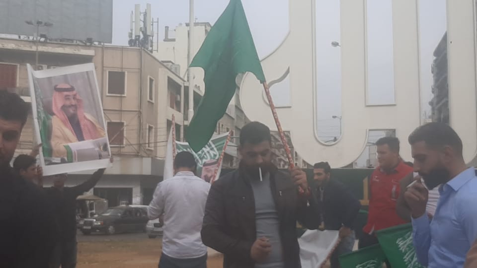 تم رفع لافتات وأعلام المملكة العربية السعودية وصور الملك السعودي وسط ساحة النور – طرابلس من قبل عدد من المواطنين، تأييداً للملكة العربية السعودية واستنكاراً لما جاء على لسان وزير الاعلام جورج قرداحي.