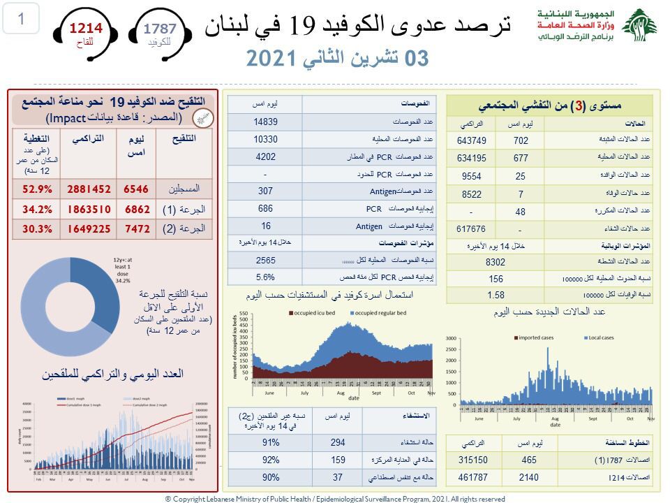 أعلنت وزارة الصحة العامة عن تسجيل 702 إصابة جديدة بفيروس “كورونا” في لبنان، رفعت إجمالي الحالات المثبتة إلى 643749.