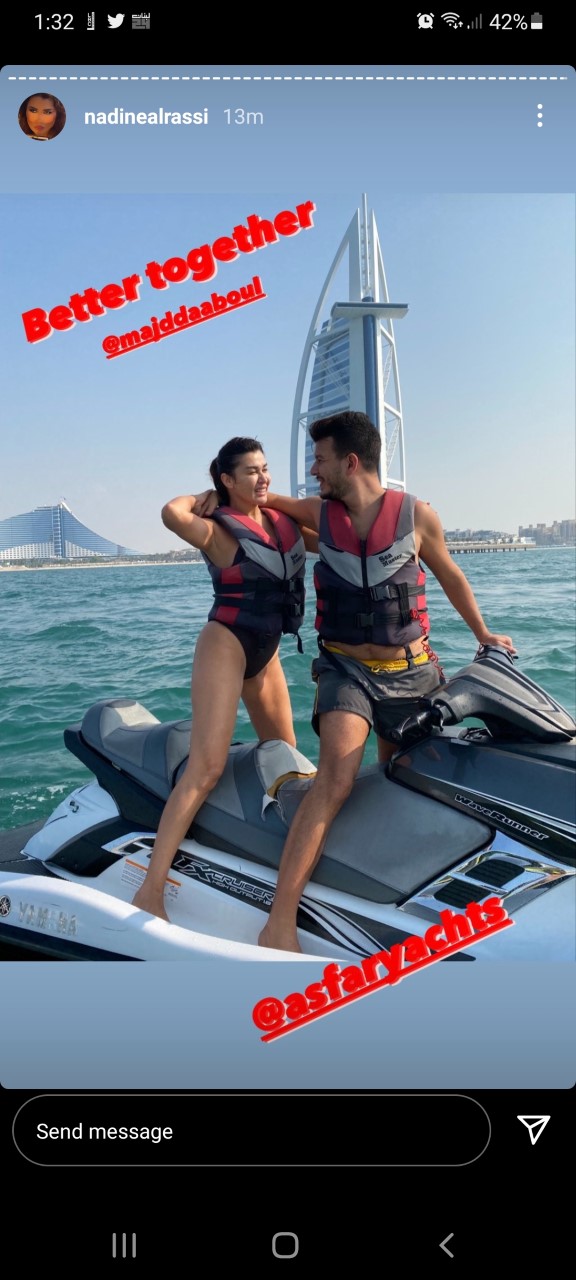 نادين متواجدة حاليا في دبي، وهي تقضي أجمل الأوقات مع خطيبها مجد دعبول كما يظهر في الصور والفيديوهات التي يتم نشرها على مواقع التواصل الاجتماعي.