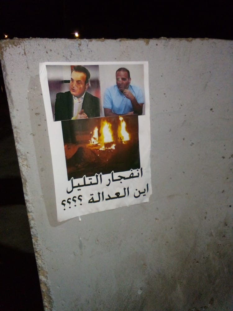 عمد عدد من المواطنين في حلبا مساء أمس، على وضع ملصقات على أبواب المصارف والمحلات وعلى الطرقات كتب عليها “إنفجار التليل – أين العدالة” واضعين صوراً لصاحب الارض والمتهم بتخزين مادة المحروقات والنائب “أسعد درغام”.