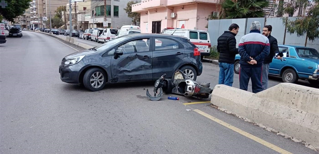 وقع حادث صدم دراجة نارية من قبل سيارة نوع كيا في شارع تقي الدين الصلح قرب محطة كنعان في صيدا، ما أدى الى إصابة سائق الدراجة م. أ مواليد عام 1994، إصابات بليغة.