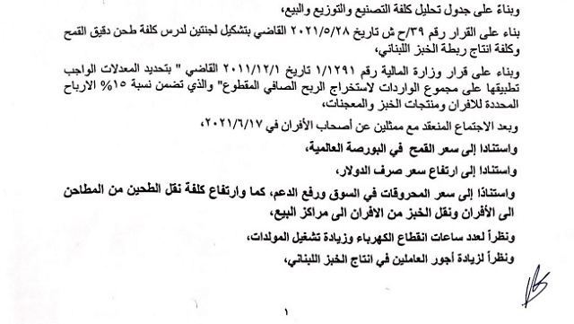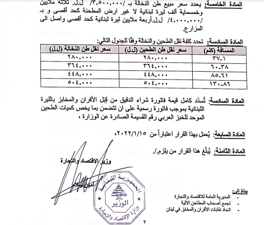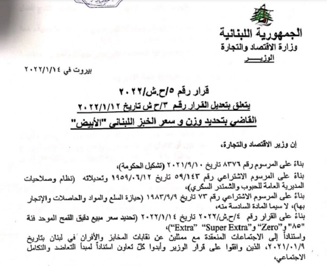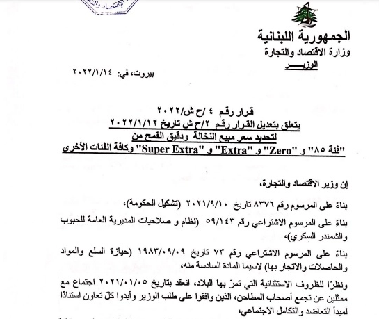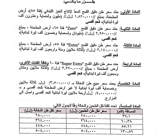ولهذه الغاية، أصدر سلام اليوم قرارين: الأول يقضي بتحديد وزن وسعر الخبز اللبناني الأبيض، والثاني يتعلق بتحديد سعر مبيع النخالة ودقيق القمح من فئة 85 وzero و extra وsuper extra وكل الفئات الأخرى.