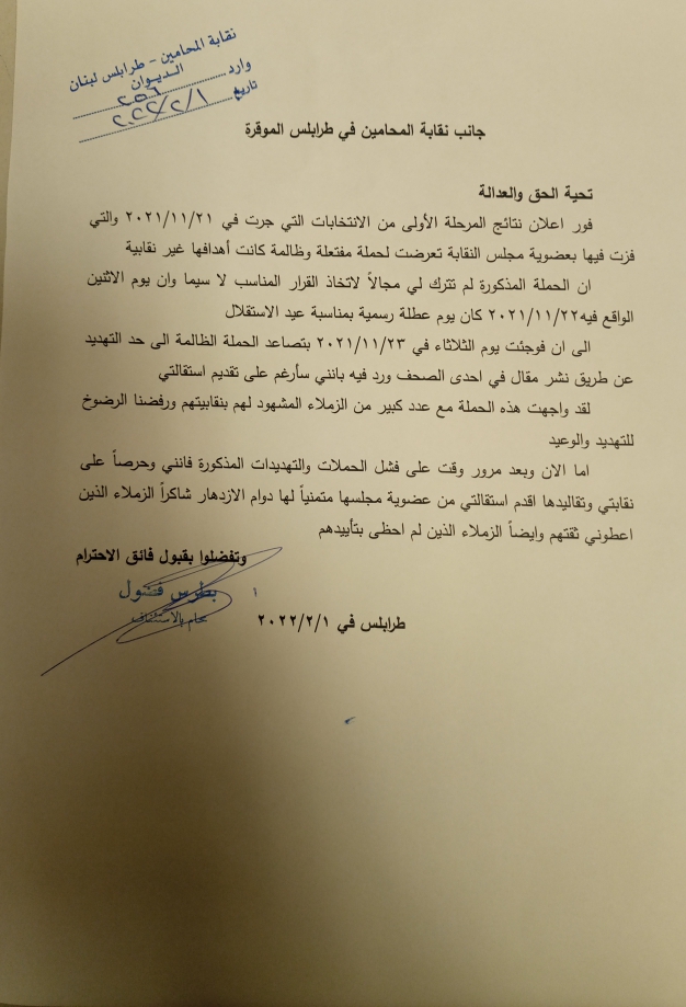 قدم المحامي بطرس فضول استقالته من عضوية مجلس نقابة المحامين في طرابلس اليوم.