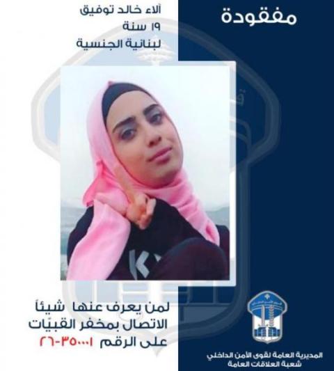 تُعمّم المديرية العامة لقوى الأمن الداخلي، بناءً على إشارة القضاء المختص، صورة المفقودة:
