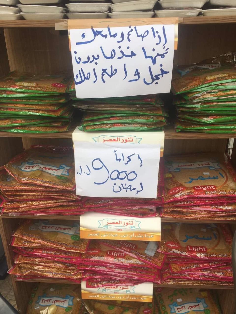 في خطوة لفتت أنظار المواطنين في طرابلس، علقت لافتة عند محلات شندب كتب عليها: “إذا صائم وما معك ثمنها خذها بدون خجل واطعم أهلك”، في إشارة إلى ربطة خبز التنور.