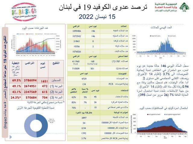 أعلنت وزارة الصحة العامة في تقريرها اليومي، تسجيل 146 اصابة جديدة بفيروس كورونا خلال الـ24 ساعة الماضية، بالاضافة الى حالتي وفاة.