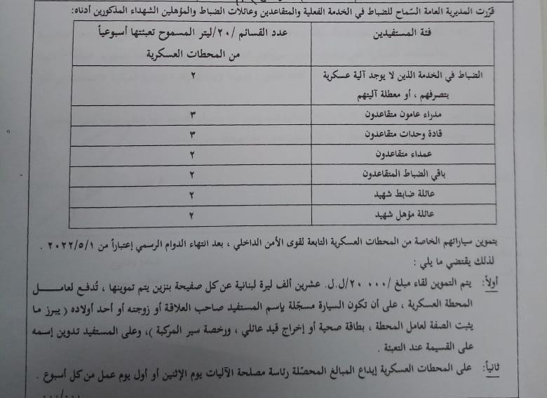 ووفقاً للبرقية، فإنّ القسيمة الواحدة تكون 20 ليتراً من البنزين، على أن تكون الاستفادة منها ضمن المحطات العسكرية. مع هذا، فقد أشارت البرقية إلى أنّه يتوجب على المستفيد من مضمون البرقية، دفع 20 ألف ليرة لعامل المحطة العسكرية، لقاء تموين صفيحة من البنزين.