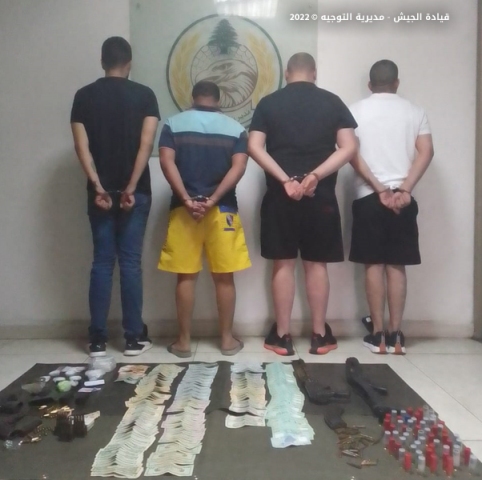 أوقفت دورية من مديرية المخابرات في بلدة كفرذبيان-جبل لبنان المواطنين: (ي،ز) و (ف،ح،ز) و(ج،ح،ز) و(ع،ن،ز)، لإقدامهم على تعاطي المخدرات وترويجها داخل أحد الشاليهات العائدة للموقوف الأول، وتجول الموقوف الثاني بمستندات مزورة (هوية، ورخصة سوق)، وبحقهم عدة وثائق إطلاق نار على دوريات عائدة للجيش في منطقة البقاع، بالإضافة إلى عدة مذكرات توقيف بجرائم تجارة الأسلحة والمخدرات، وضبطت بحوزتهم كمية من المواد المخدرة وسلاحين حربيين مع ذخائرهما.