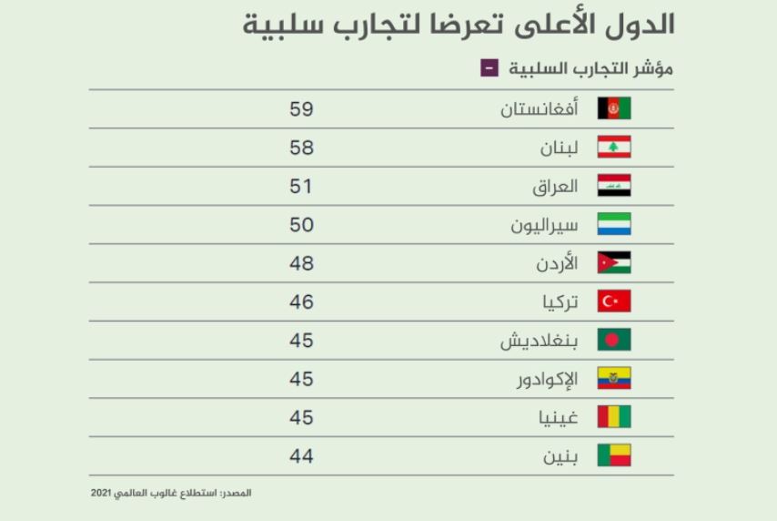 وقد جاء ترتيب الدول العشر الأكثر تعرضا للمشاعر السلبية على النحو التالي: أفغانستان، فلبنان، ثم العراق، فسيراليون فالأردن فتركيا ثم بنغلاديش والإكوادور وغينيا وأخيرا بنين.