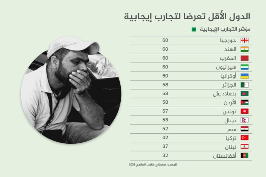 وعلى مستوى الدول، فقد جاءت الدول التي تعرض مواطنوها إلى أحداث أو خبرات إيجابية أقل على التوالي: جورجيا والهند والمغرب وسيراليون وأوكرانيا، ثم الجزائر وبنغلاديش فالأردن فتونس فنيبال فمصر ثم تركيا فلبنان، وقد أتت أفغانستان في ذيل القائمة التي يقول التقرير إنها تحتلها منذ عام 2017.