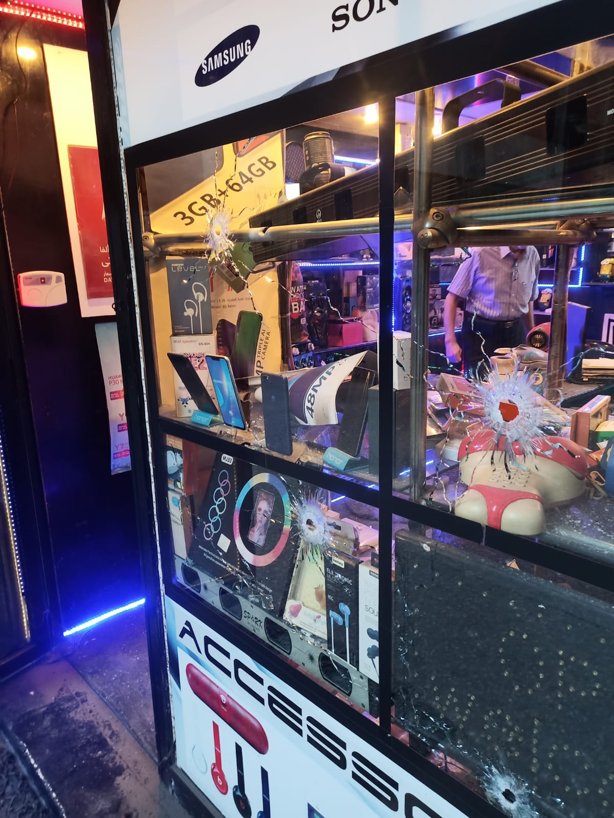 وأصاب الرصاص واجهة أحد محال بيع الهواتف الخليوية، ما أدى الى تحطّم زجاجها.