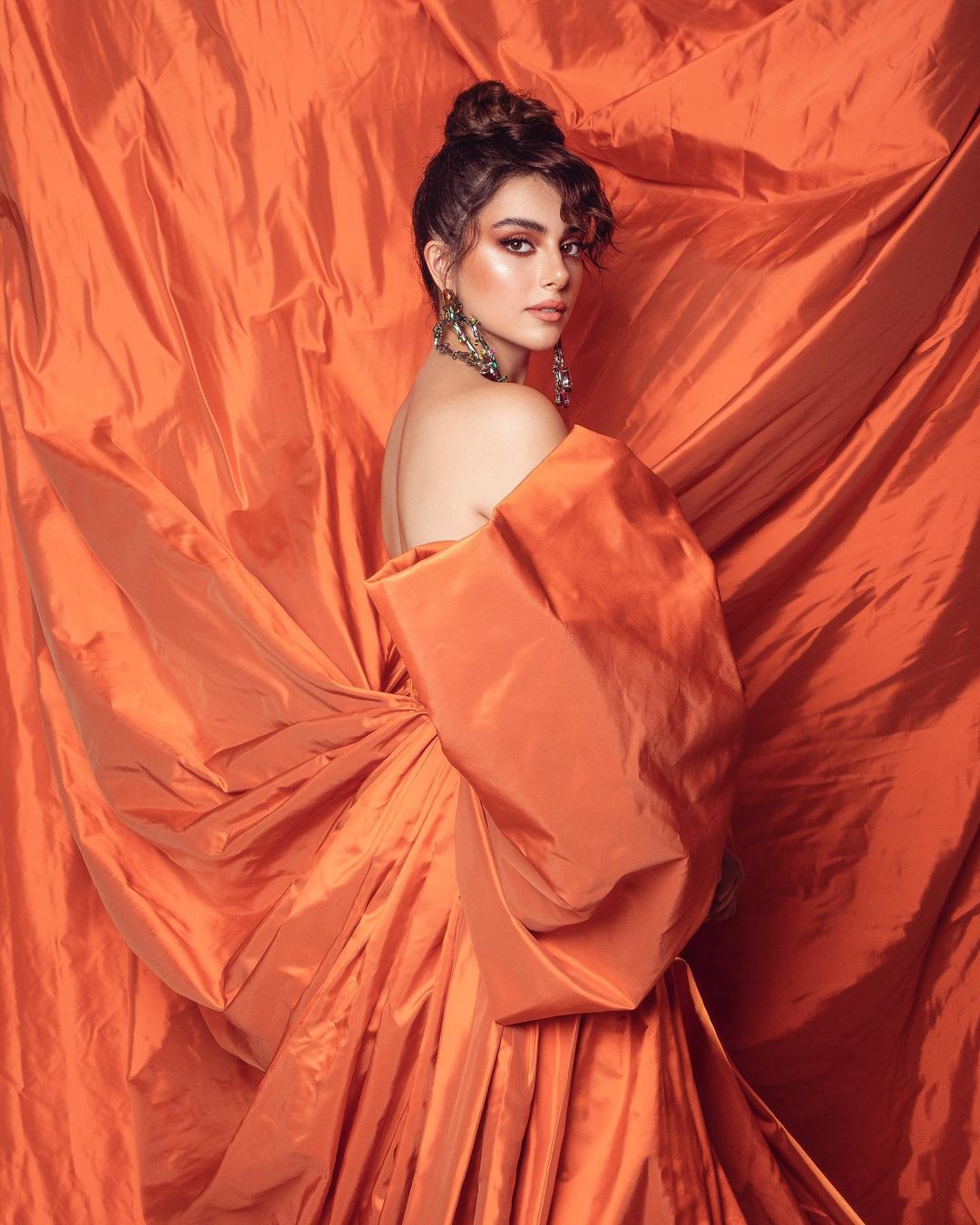 وظهرت بفستان ضخم طويل من الساتان باللون البرتقالي واعتمدت تسريحة الشعر الشينيون وماكياجا مائلا إلى اللون البرتقالي.