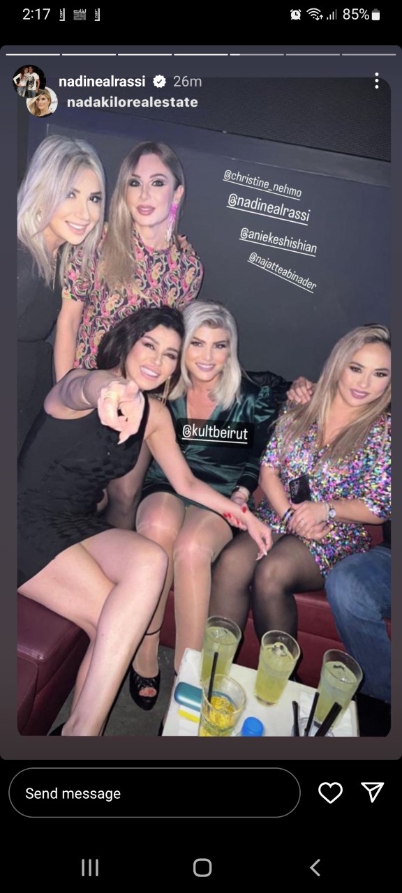 وظهرت نادين بفستان ضيق قصير باللون الأسود وهي ترقص وتستمتع بوقتها مع أصدقائها في أحد أماكن السهر في بيروت.