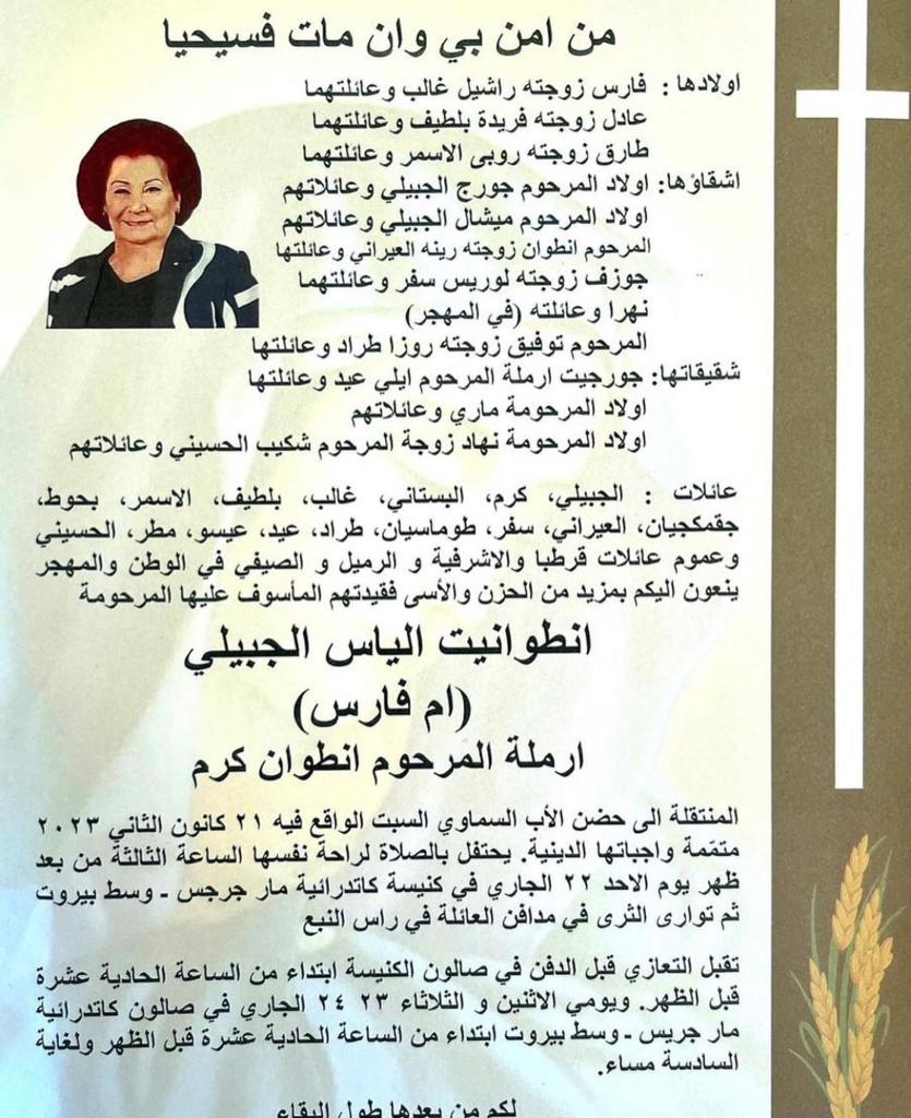 يُحتفل بالصلاة لراحة نفس الفقيدة عند الساعة الـ3 من بعد ظهر يوم الأحد 22 الجاري في كنيسة كاتدرائية مار جرجس – وسط بيروت، ثم توارى الثرى في مدافن العائلة في رأس النبع.