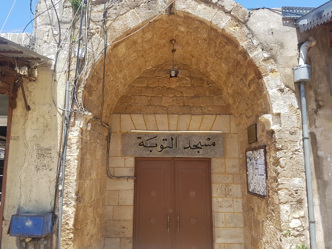 جاءت تسميته بالتوبة وفقا لروايات يتداولها الناس تفيد، أن المهندس الذي أوكل إليه أمر بناء الجامع المنصوري الكبير اختلس من الأموال المخصصة له فجاء خاليا ً من الزخرفةالفنية، وعندما اكتُشف أمره تعهّد للسلطان ببناء جامع آخر، فبنى هذا الجامع المعروف بالتوبة وجاء شبيها ً بالجامع الكبير. وليس فيه من علامات فارقة سوى في مئذنته السداسية الشكل والمبنية بالحجارة الرمليّة وبطراز عسكري دفاعي، وقبابه الثلاث الصغيرة والتي تظهر من الداخل على أشكال الزهور، وساعته الشمسية التي ظهرت مؤخرا خلال أعمال ترميم كانت تجري في المسجد وهي طبق الأصل لتلك الموجودة في الجامع الكبير.