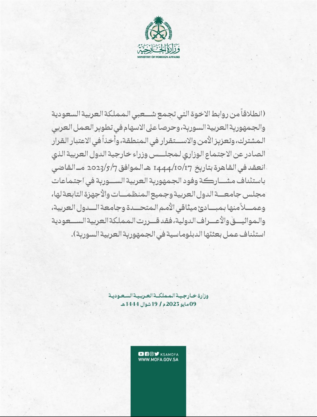 09MAY السعودية تعلن استئناف عمل بعثتها الدبلوماسية في سوريا Share Tweet Share Whatsapp Email أعلنت وزارة خارجية المملكة العربية السعودية أن المملكة قّررت استئناف عمل بعثتها الدبلوماسية في الجمهورية العربية السورية. Related Postsالسّعودية تنفض يدها من الإستحقاق الرئاسي.. اللبنانيون تائهون!… عبد الكافي الصمدبعد الرياض.. سوريا تعلن استئناف عمل بعثاتها الدبلوماسية في السعوديةدعوة لميقاتي من السعودية للمشاركة في "قمة جدّة".. ولقاءٌ مع منسق الأمم المتحدة ووزراءميقاتي يتسلم دعوة من العاهل السعودي للمشاركة باجتماع الجامعة العربية في جدّة Post Author: SafirAlChamal