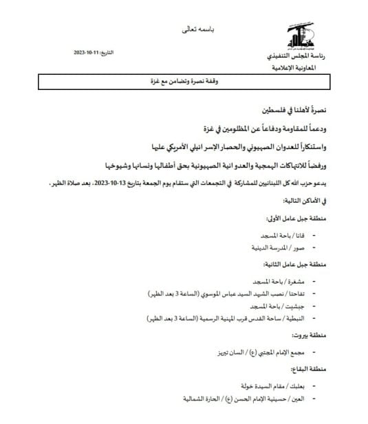 دعا حزب الله كل اللبنانيين للمشاركة في التجمعات التي ستقام يوم الجمعة بتاريخ ١٣/١٠/٢٠٢٣ بعد صلاة الظهر.