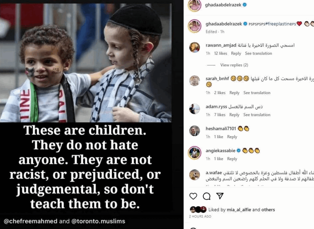 وظهر في منشور غادة، صورة لطفل فلسطيني يحمل علم بلاده، مع طفل إسرائيلي بالزي اليهودي، وكتبت عليها تعليقاً بالإنكليزية يقول: “هؤلاء أطفال، لا يكرهون أحداً.. هم ليسوا عنصريين.. ولا متحاملين على أحد.. أو يصدرون أحكاماً سريعة.. فلا تعلموهم أن يكونوا كذلك”. وهو ما جعل الجمهور ينتفض، ويطالبها بحذف هذه الصورة.