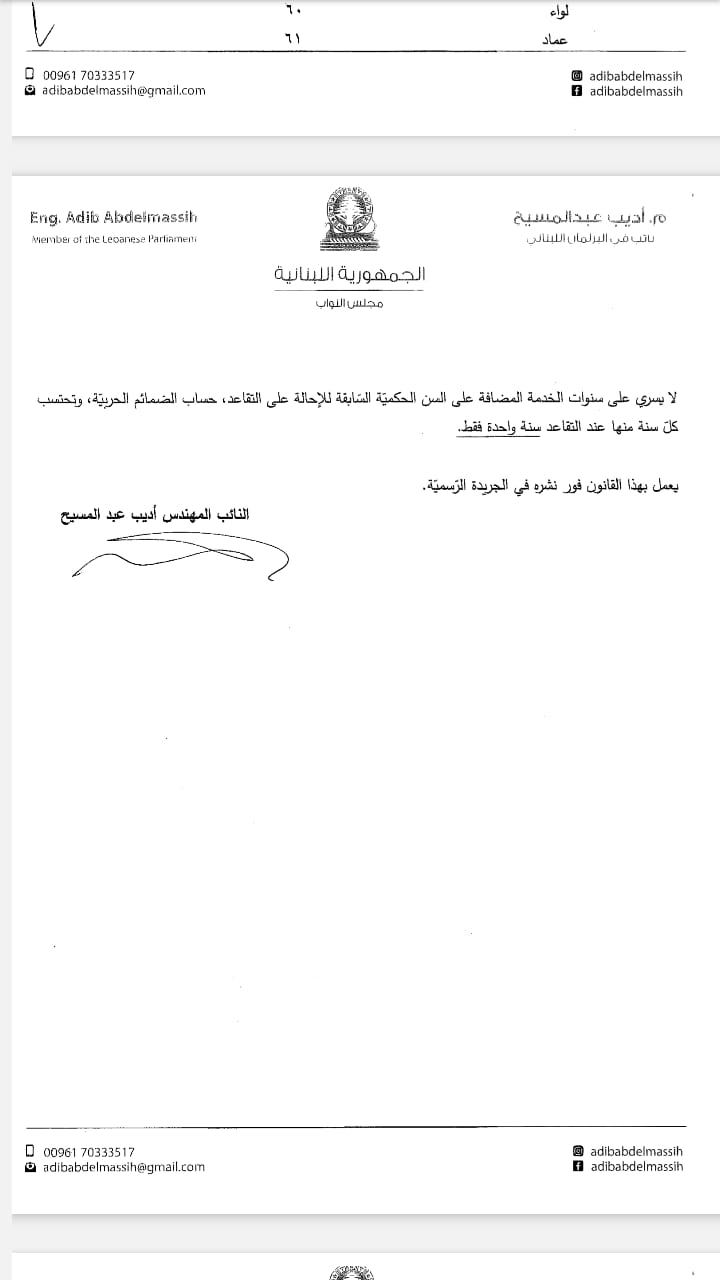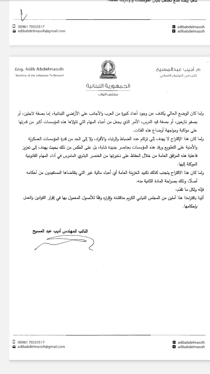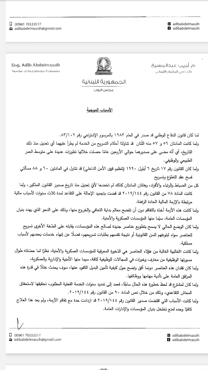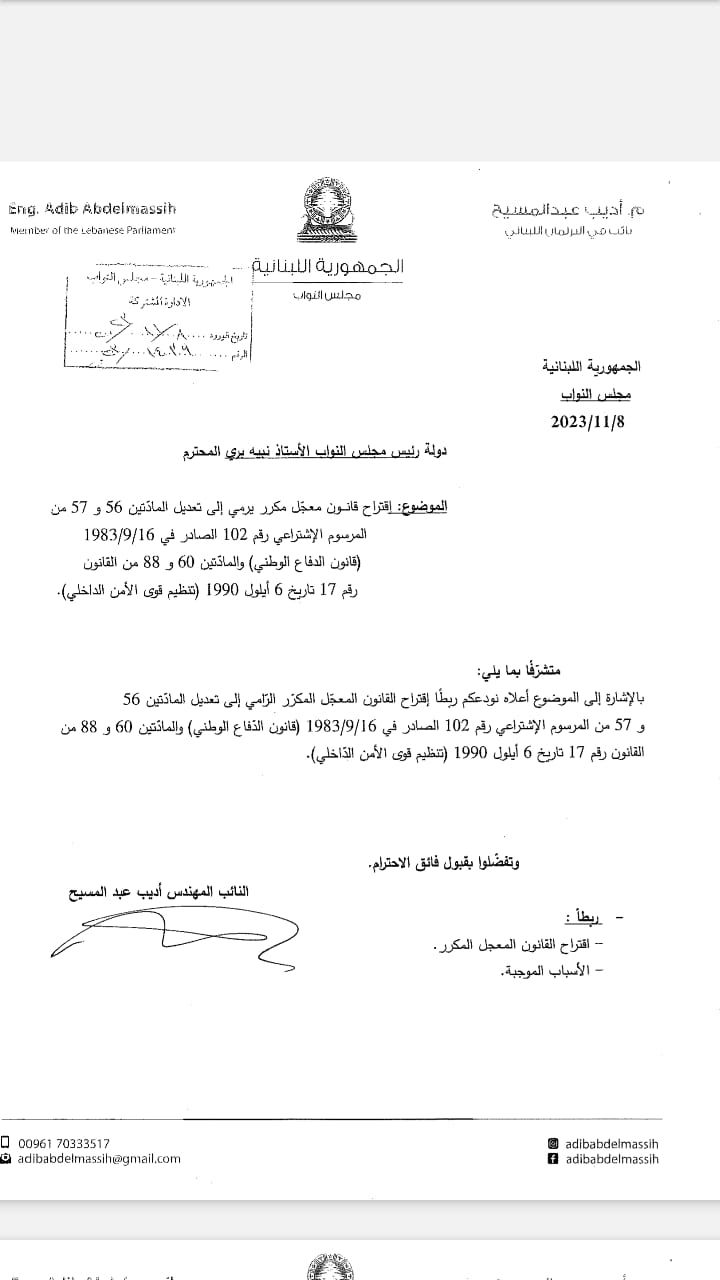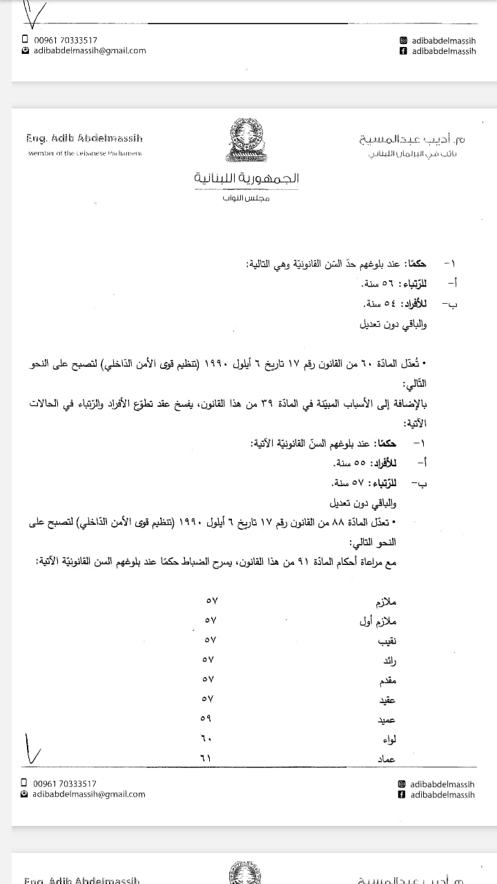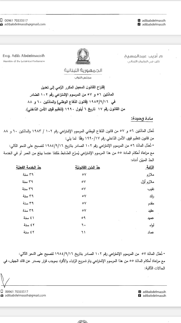 تقدم النائب أديب عبد المسيح اليوم، باقتراح قانون معجل مكرر لرفع السنّ القانونية من رتبة ملازم إلى رتبة عماد، كما يرمي إلى تعديل قانوني الدفاع الوطني وتنظيم قوى الأمن الداخلي.