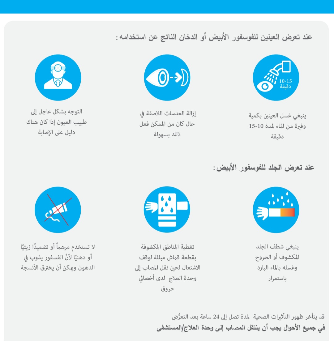 – اتباع تعليمات وزارة الصحة العامة ومنظمة الصحة العالمية المتعلقة بالتعامل مع الفوسفور الأبيض.