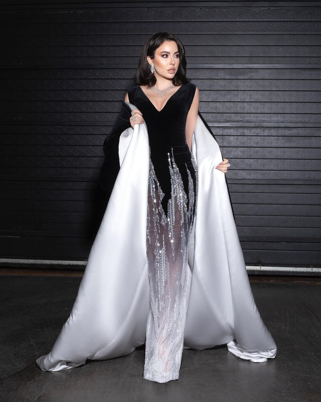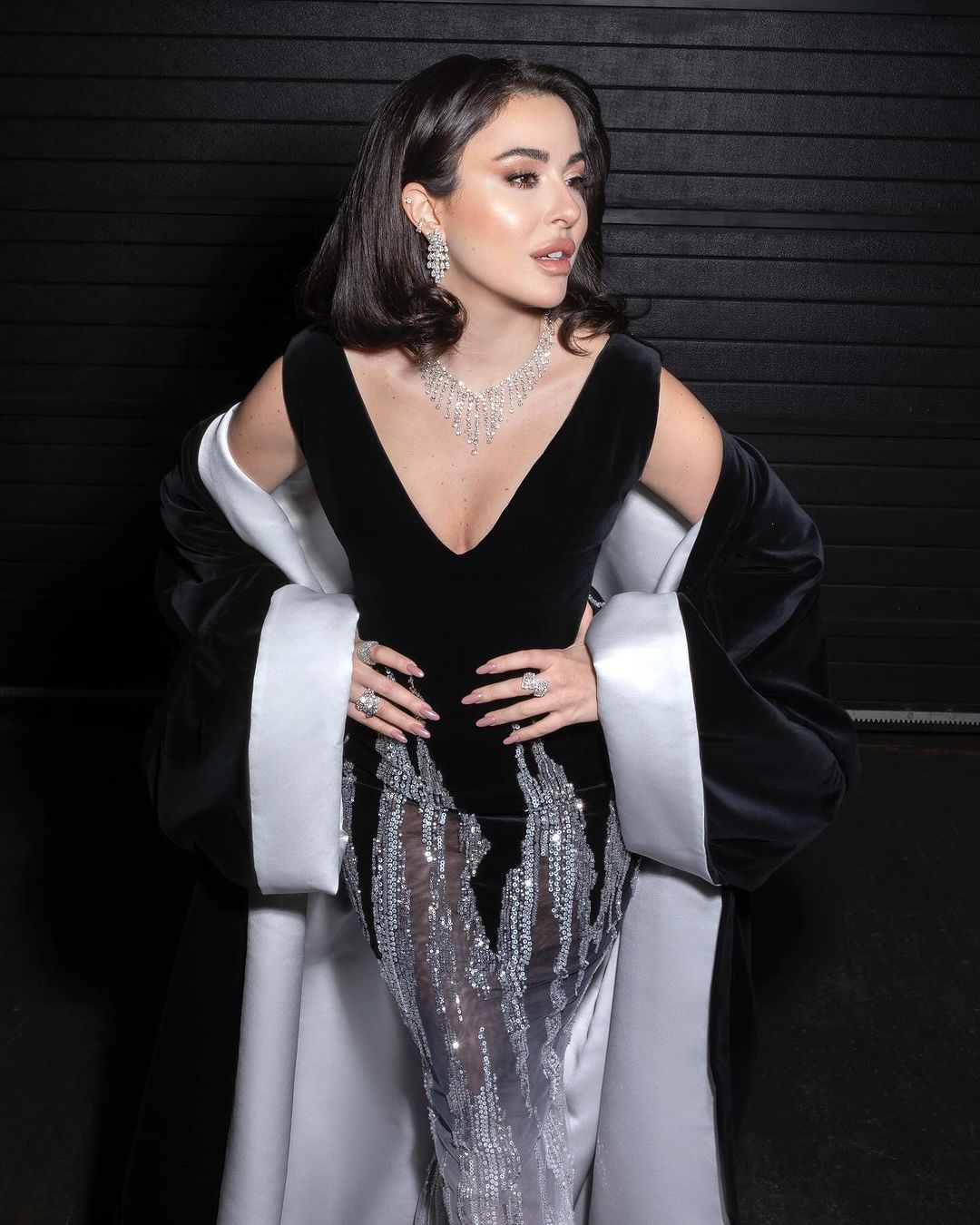 ولفتت سارة الأنظار بإطلالتها حيث اختارت فستانا من تصميم المصمم اللبناني انطوان القارح باللونين الأسود والفضي ويتميز بقماشة الموسلين في جزئه السفلي.