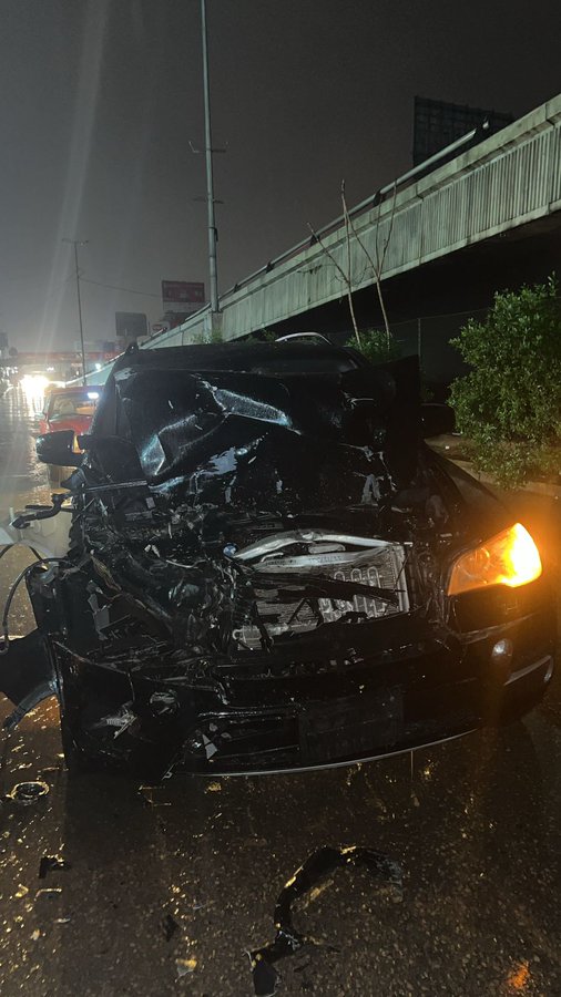 ونشرت الهاشم صورة، حيث ظهرت سيارة نجلها، متضرّرة بشدّة.