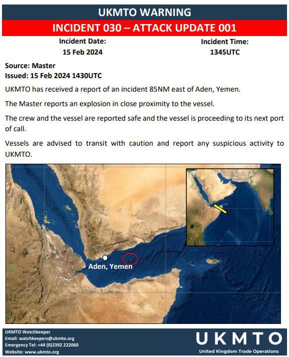 وأفادت وكالة “العمليات التجارية البحرية التابعة للمملكة المتحدة” أن السفينة بلّغت عن وقوع “انفجار على مسافة قريبة منها” شرق عدن.