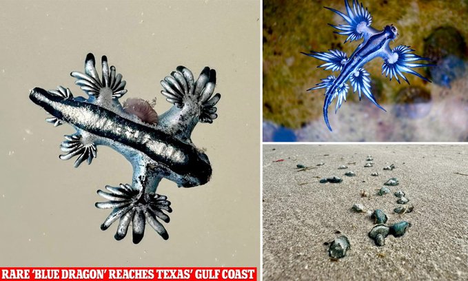 واكتشف جيس تونيل، أحد دعاة الحفاظ على البيئة البحرية الذي ينتج سلسلة “Beachcombing” لمعهد Harte للأبحاث المختصة بدراسات خليج المكسيك، كائنات “التنين الأزرق” الخطيرة، والتي تعرف بكونها نوع من الرخويات البحرية، على طول جزيرة “نورث بادري”، جنوب كوربوس كريستي بولاية تكساس.