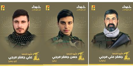 البيان الثالث: “بمزيد من الفخر والإعتزاز، تزف المقاومة الإسلامية الشهيد المجاهد حسن جعفر مرجي “باقر” مواليد عام 1996 من بلدة بليدا في جنوب لبنان، والذي ارتقى شهيداً على طريق القدس”.