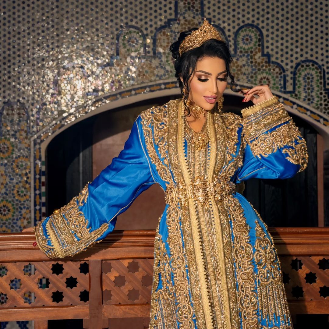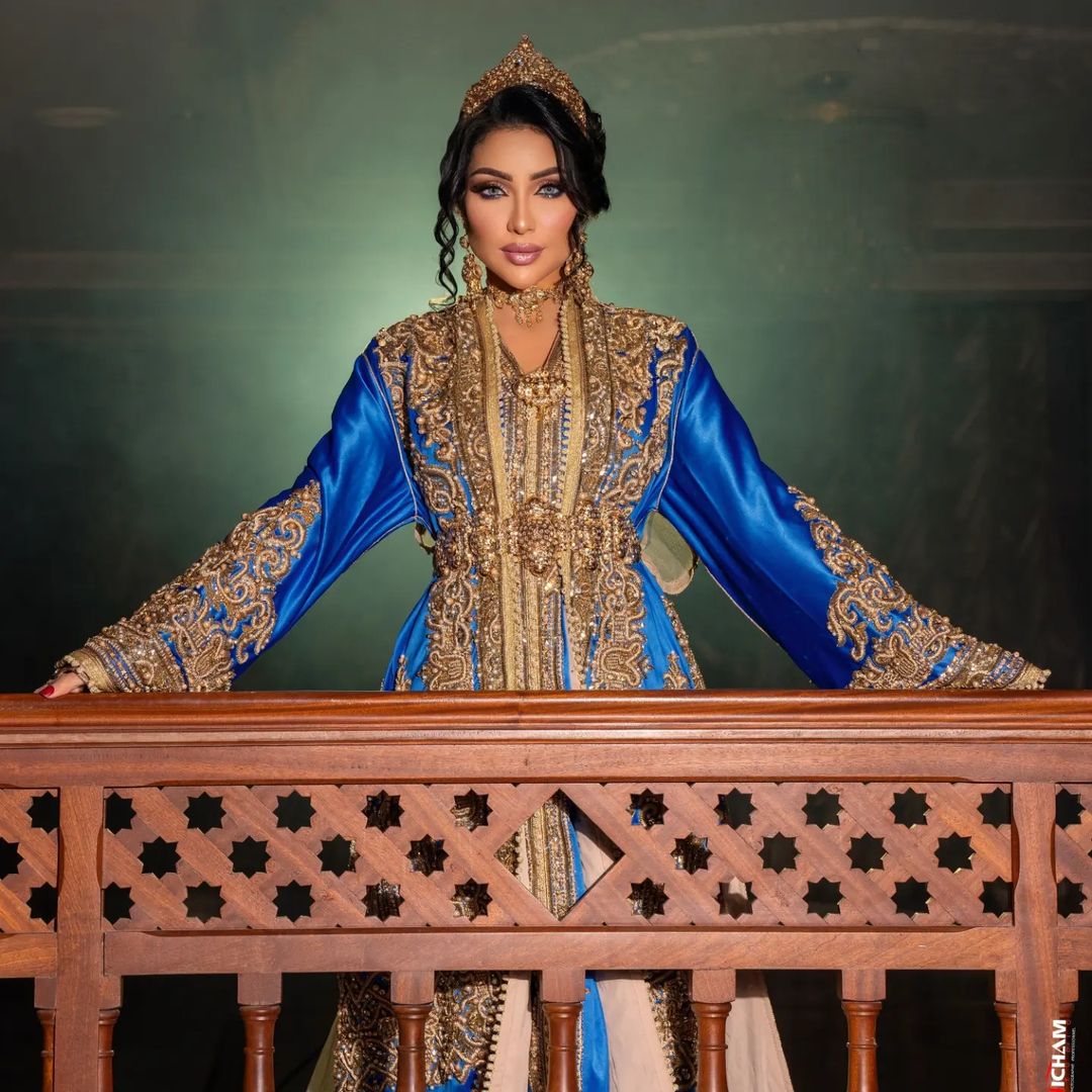 ولفتت اطلالة دنيا الأنظار، إذ ظهرت بالصور بالقفطان المغربي التقليدي باللون النيلي مع تطريزات ذهبية تزيّن كامل أطرافه، وجاء الثوب مع كاب واسع وطويل من اللون نفسه وبنفس التطريزات، أضاف لمسة من الفخامة الى القفطان.