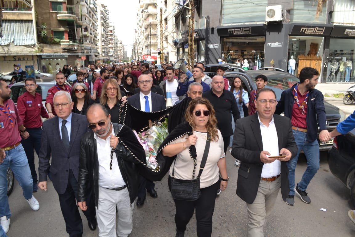 تخلل الزياح حمل نعش المسيح في الشوارع المحيطة بالكنيسة لا سيما في شوارع قاديشا والمطران وعزمي، حيث طاف المؤمنون خلف النعش يتقدمهم سويف والكهنة، وسط قرع للاجراس وارتفاع أصوات التراتيل الخاصة بمناسبة يوم الجمعة العظيمة.