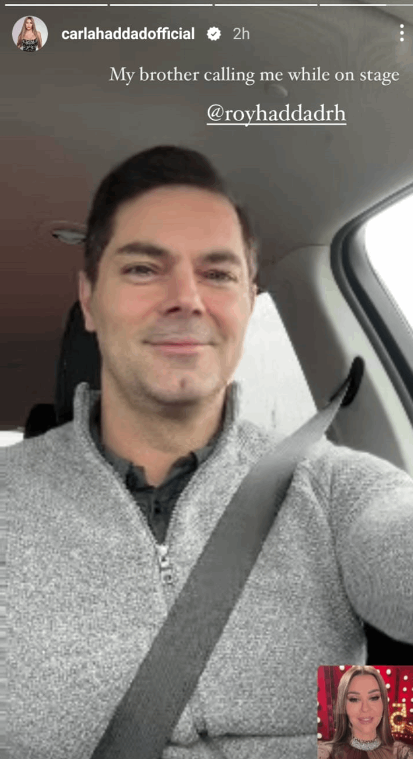 وبدا في الصورة شقيق كارلا روي حداد، وعلقت عليها بالقول: “اخي يتصل بي أثناء تواجدي على المسرح”.