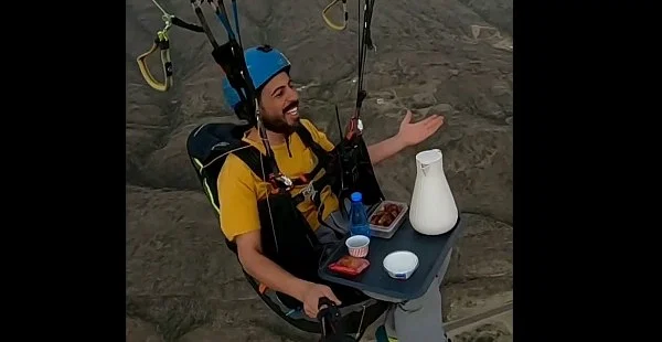 وفي فيديو نشره عبر مواقع التواصل الاجتماعي، يمكن رؤية القحطاني وهو يستمتع بوجبة إفطار شاهقة في الجو، وفوق التضاريس الوعرة لجبل “هادا” الواقع في محافظة محايل عسير.