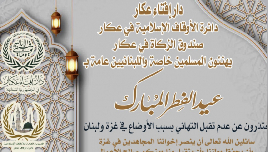 هنأ دار إفتاء عكار ودائرة الأوقاف الإسلامية وصندوق الزكاة في عكار ، في بيان” المسلمين خاصة واللبنانيين عامة بعيد الفطر المبارك”، معلنين اعتذارهم “عن عدم تقبل التهاني بسبب الأوضاع في غزة ولبنان، سائلين الله تعالى أن ينصر أخواننا المجاهدين في غزة وأن يحفظ وطننا وأن يتقبل منا ومنكم صالح الأعمال” .