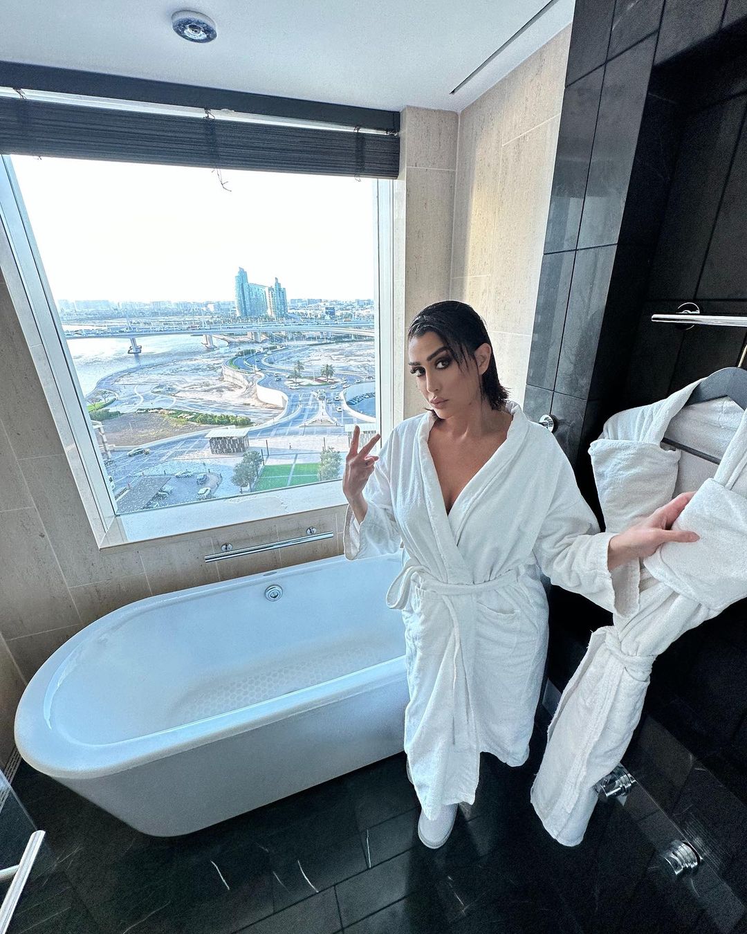 وأطلت غادة في الصور من الحمام، مرتدية “البرنص” الأبيض (روب الاستحمام) ومستندة على البانيو.