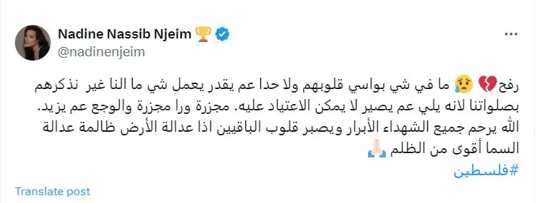 وقالت الفنانة اللبنانية في منشور لها عبر منصة “إكس”: “رفح ما في شي بواسي قلوبهم ولا حدا عم يقدر يعمل شي ما النا غير نذكرهم بصلواتنا لانه يلي عم يصير لا يمكن الاعتياد عليه”.