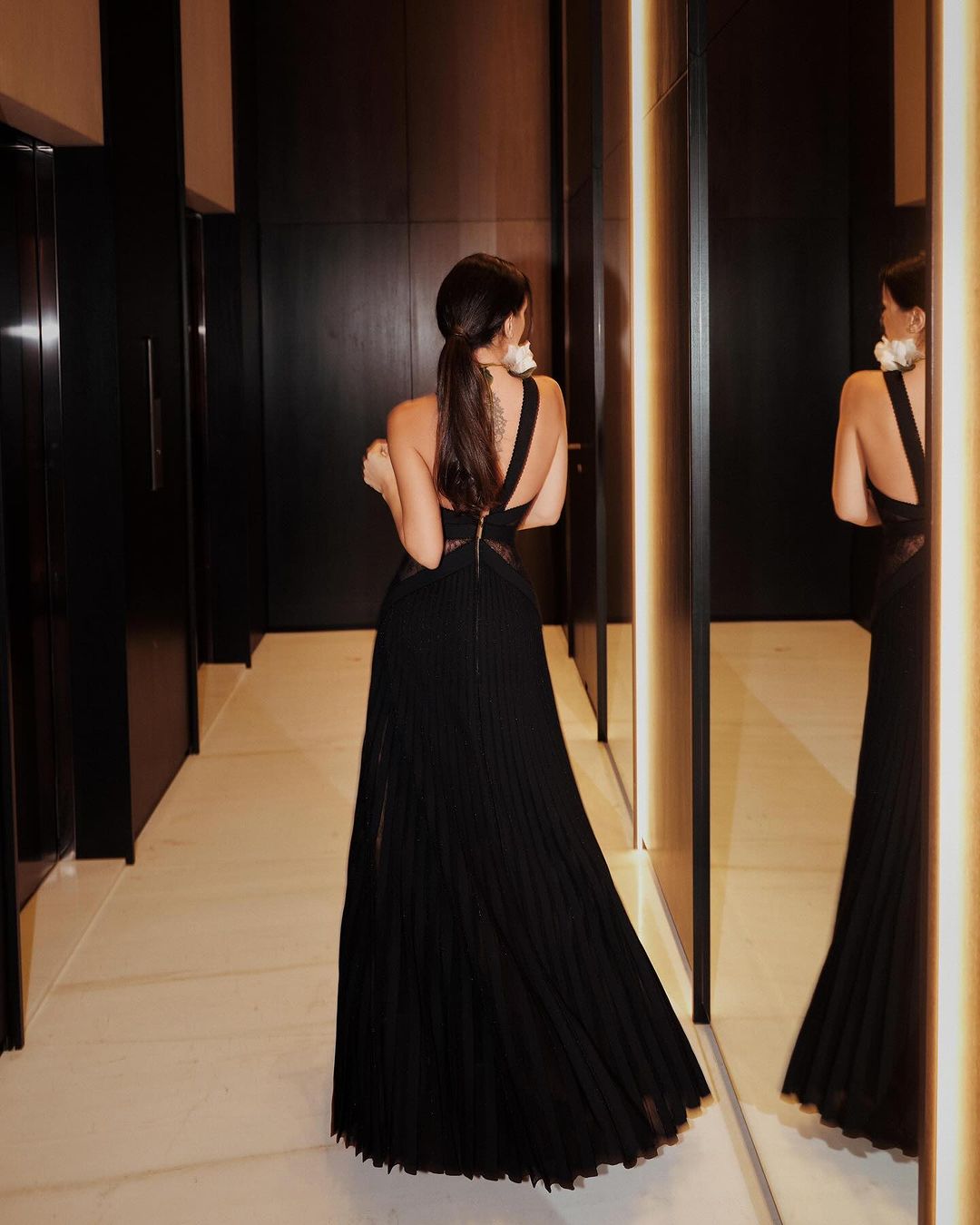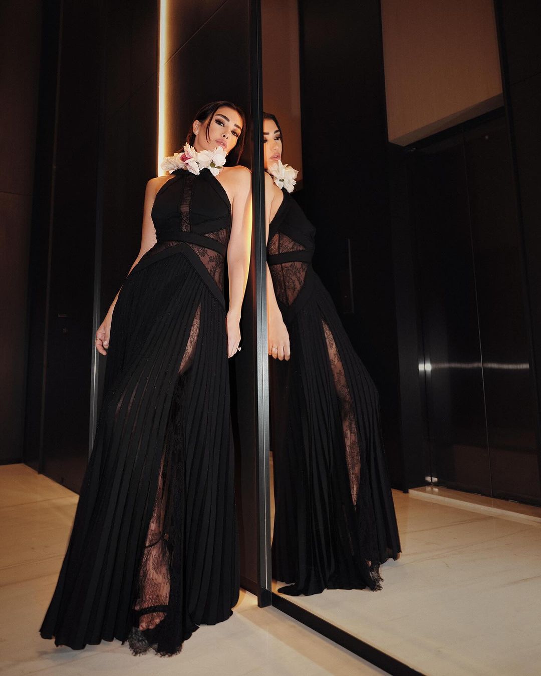 وأطلت جيسيكا بفستان أسود طويل يتميز بدانتيل شفاف وبالورود عند منطقة الرقبة من توقيع المصمم اللبناني العالمي ايلي صعب.