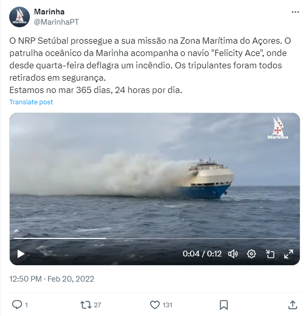 فالبحث عنه، بتجزئته الى مشاهد ثابتة (Invid)، يوصلنا الى البحرية البرتغالية التي نشرته في حسابها في اكس في 20 شباط 2022 مع تعليق: “تواصل NRP Setúbal مهمتها في منطقة جزر الأزور البحرية. وترافق دورية بحرية تابعة للبحرية السفينة فيليسيتي آيس Felicity Ace التي يندلع فيها حريق منذ الأربعاء (16 منه). وتم إجلاء جميع أفراد الطاقم بسلام”.