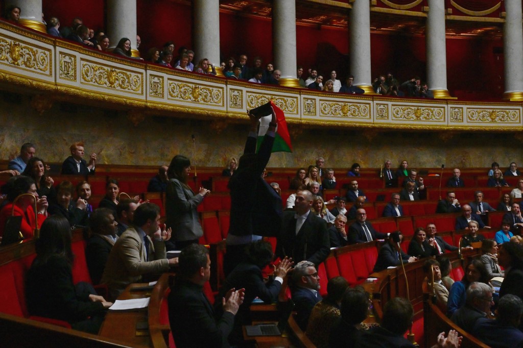 رفع النائب عن حزب فرنسا الأبية (يسار متطرف) سيباستيان ديلوغو علما فلسطين الثلثاء في الجمعية الوطنية خلال سؤال الى الحكومة حول الوضع في قطاع غزة، الأمر الذي أدى إلى تعليق الجلسة.
