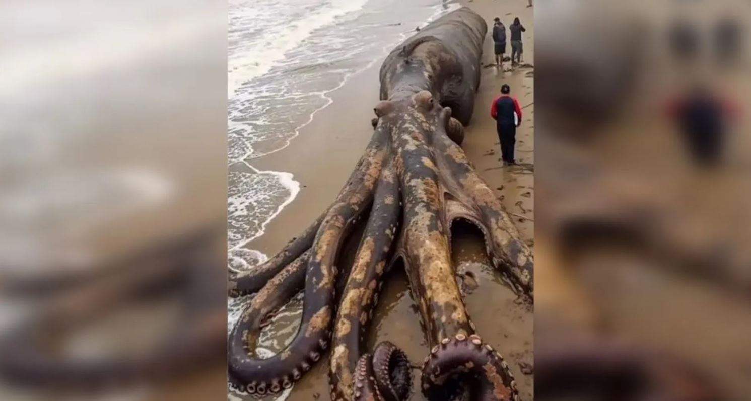وتظهر الصورة أخطبوطا عملاقا بأطراف طويلة تمتد لعدة أمتار، فيما كان بعض الأشخاص حوله يبدون صغارا، ربما للتحقق منه أو التقاط صور.