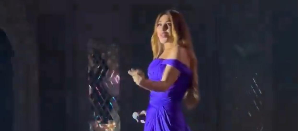 وأطلت نجوى بفستان باللون البنفسجي من توقيع المصمم اللبناني نيكولا جبران أظهر نحافة جسدها وذلك خلال تواجدها في قبرص.