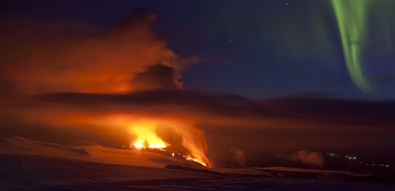 ورصدت اللقطات الفريدة الأضواء الشمالية متوهجة فوق بركان أيسلندا، بينما تتدفق الحمم البركانية من قمته.