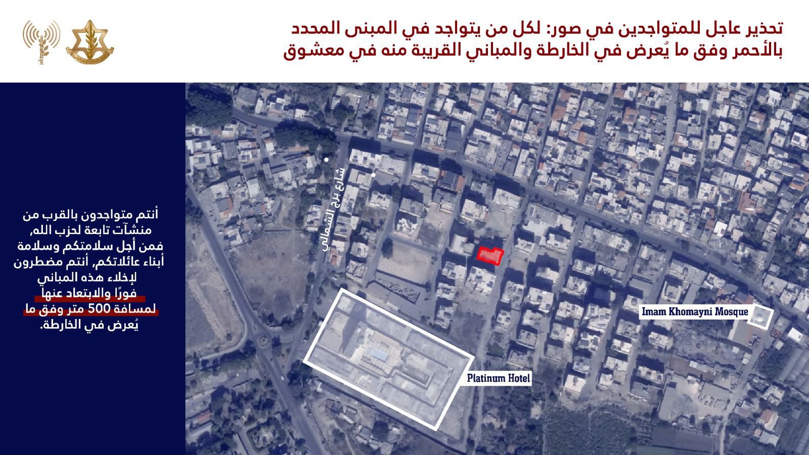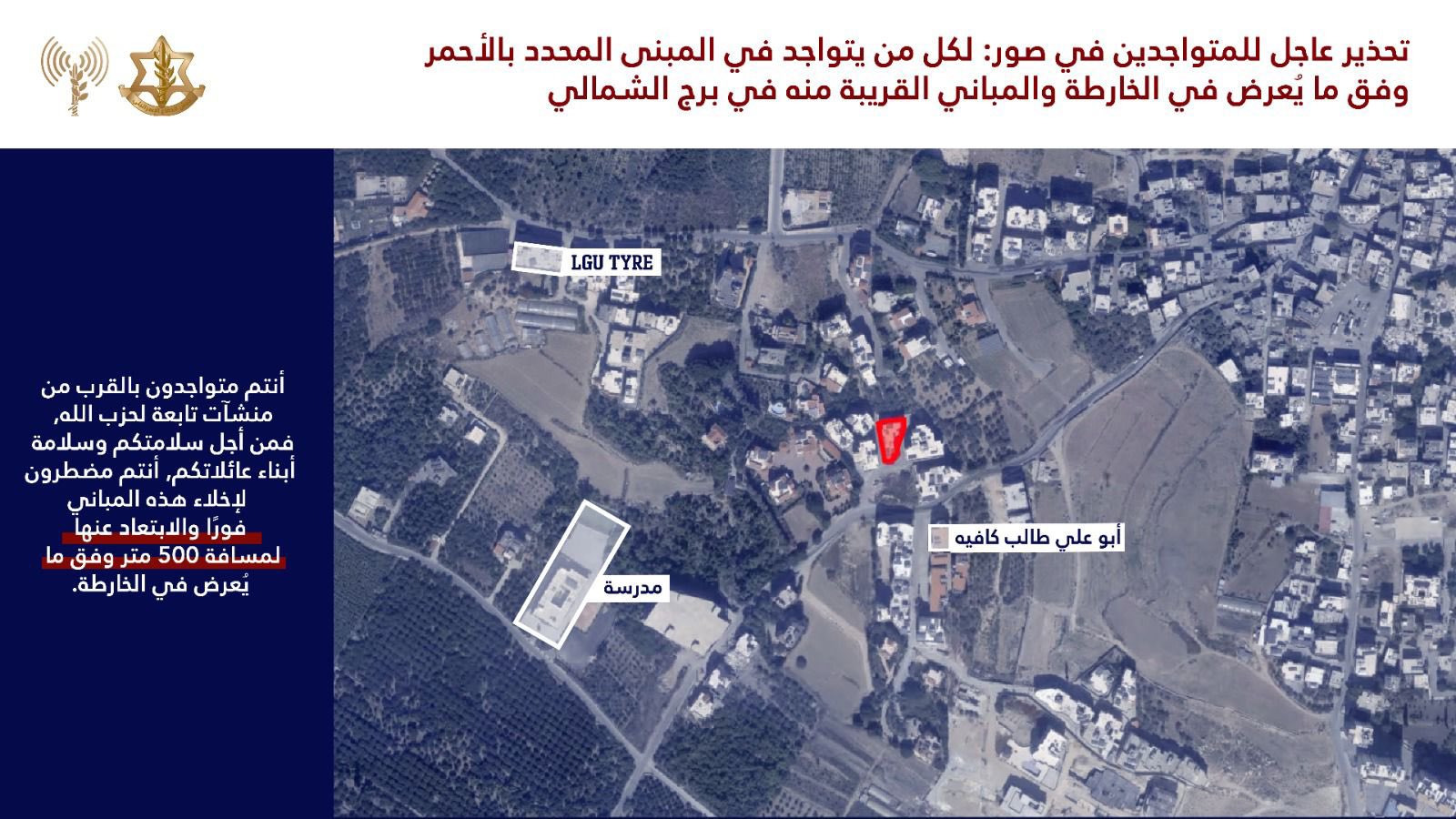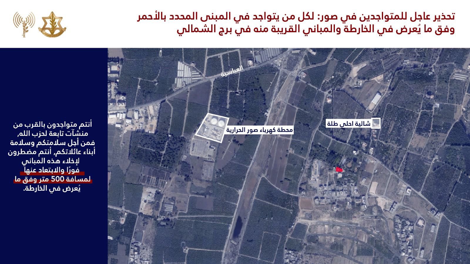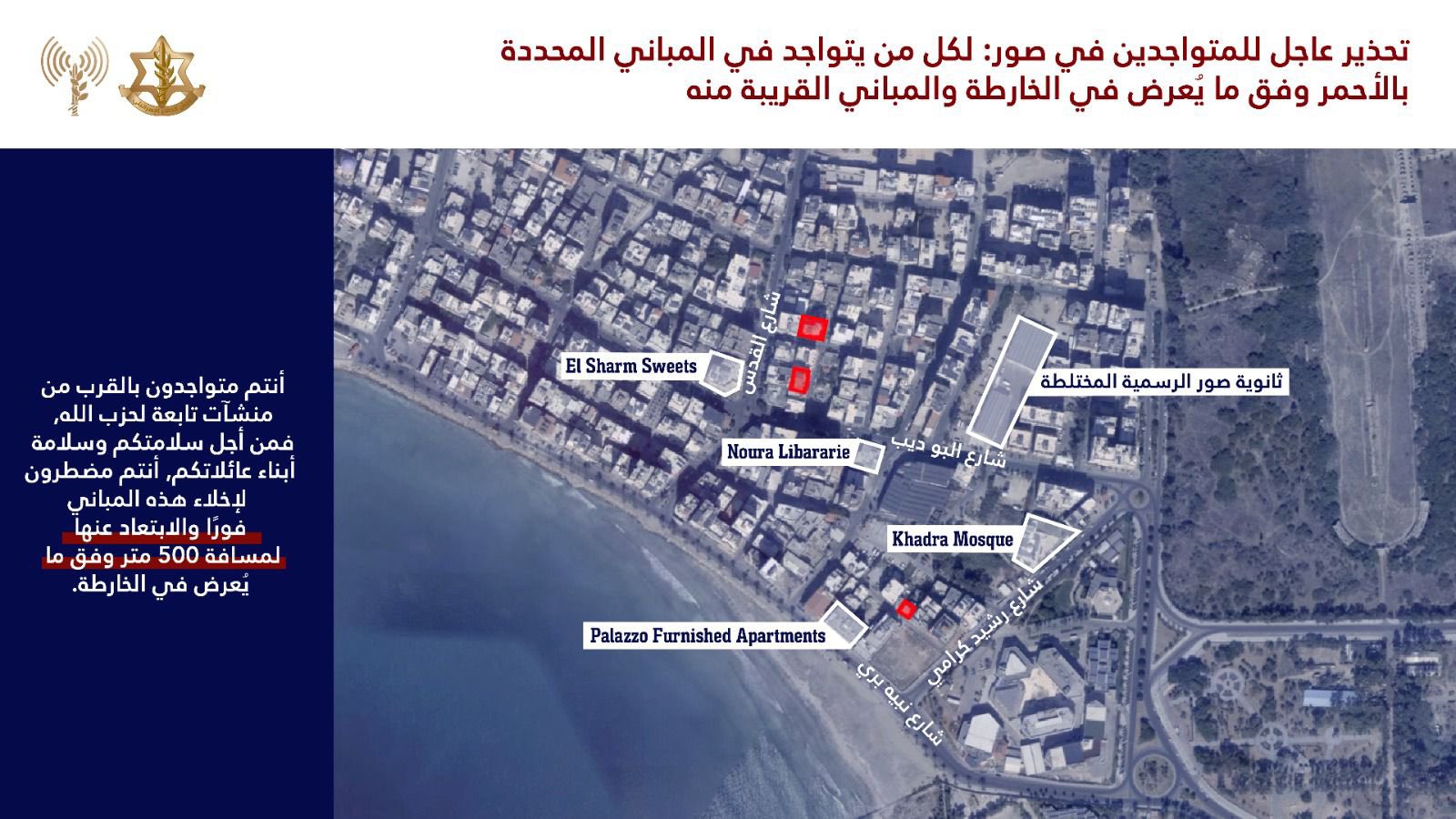 وجّه الجيش الإسرائيلي تحذيراً واسع النطاق لمناطق عديدة في مدينة صور وضواحيها، الحوش، البرج الشمالي ومعشوق.