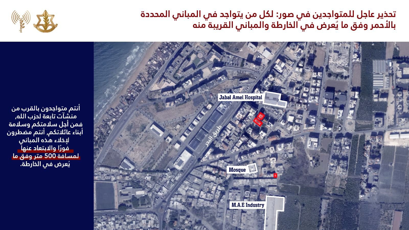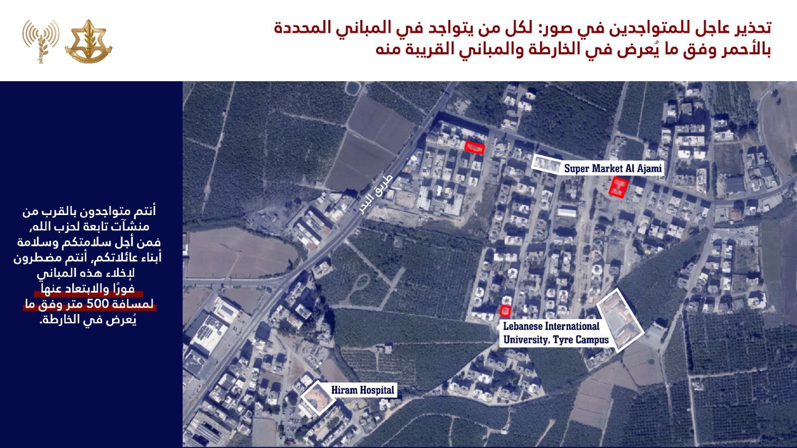 وتُظهر الخرائط التي نشرها المتحدث باسم الجيش الإسرائيلي أفيخاي أدرعي، صوراً لمبانٍ مهدّدة بالاستهداف في جوار مستشفى جبل عامل ومبنى لجامعة الـLIU.
