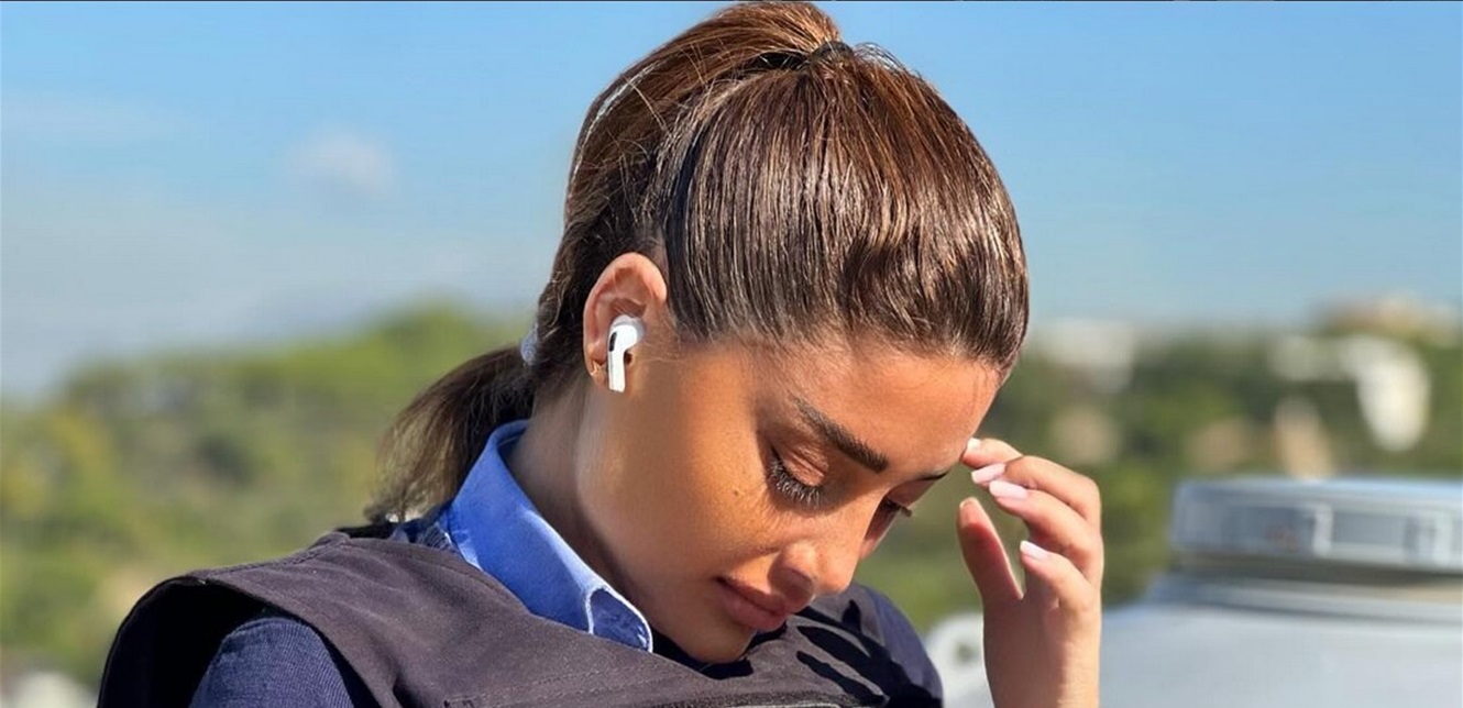 وظهرت رولا في الصورة وهي تقوم بتغطية الغارة الإسرائيلية التي استهدفت أمس الأحد منطقة راس النبع في بيروت.
