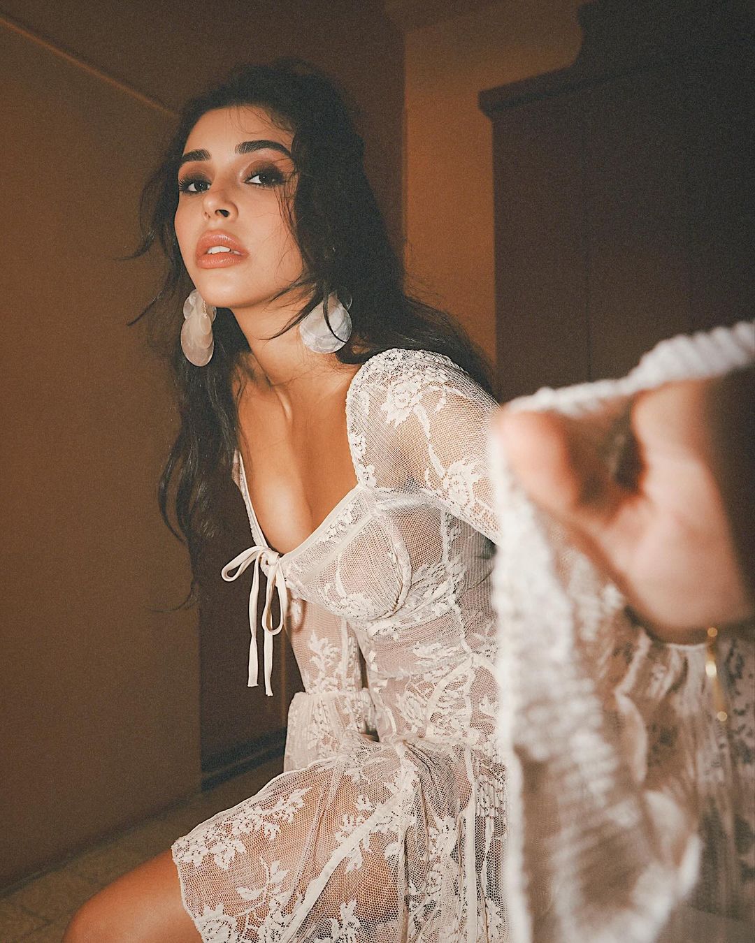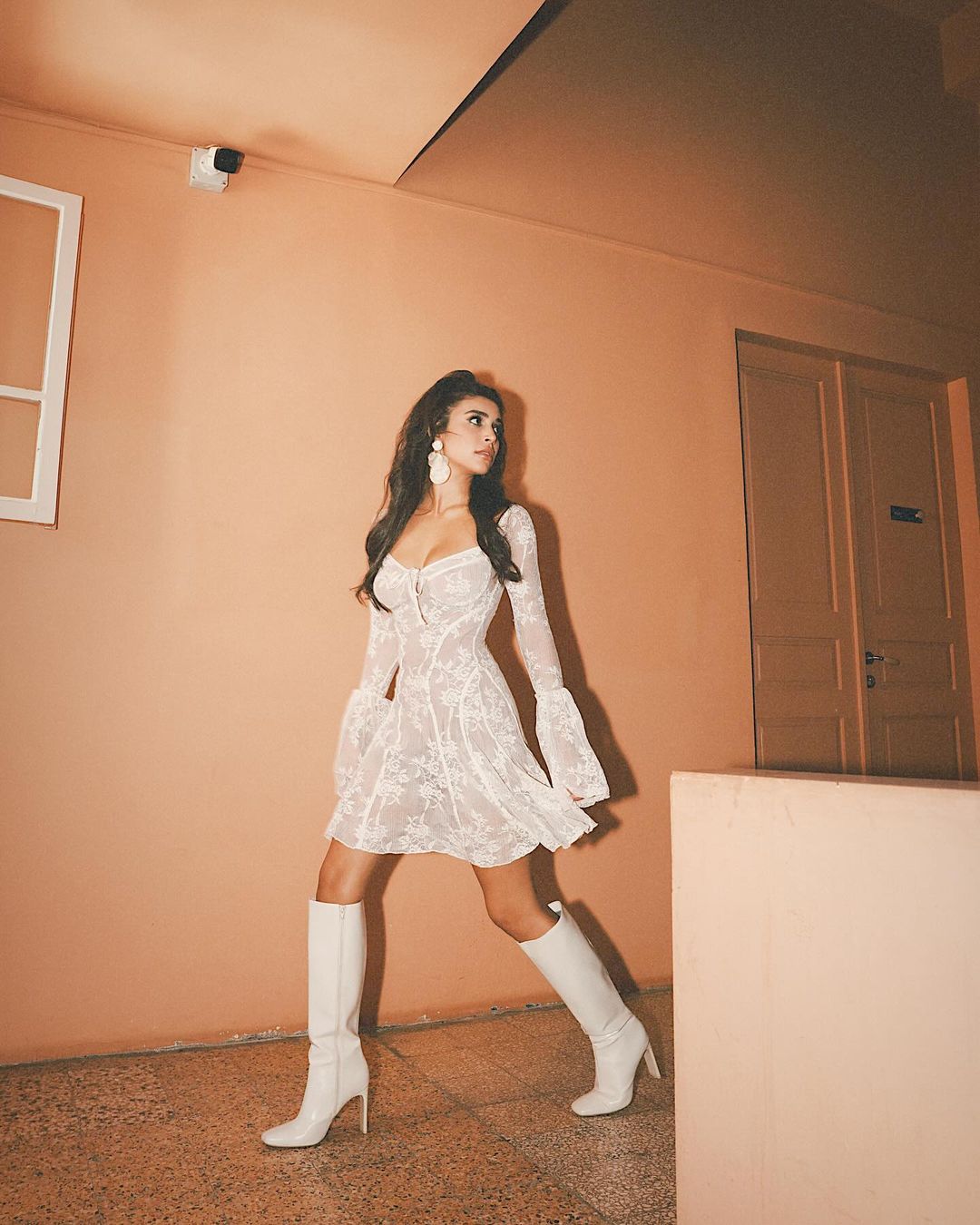 وأطلت ياسمينا بفستان أبيض من الدانتيل الشفاف نسقته مع “بوتين” باللون نفسه.