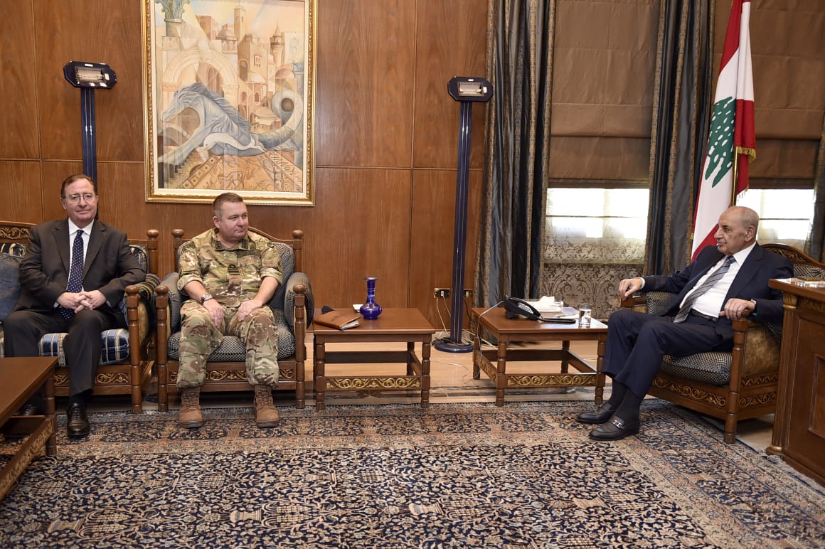 الرئيس نبيه بري تابع أيضا تطورات الاوضاع السياسية والميدانية في لبنان والمنطقة خلال استقباله كبير مستشاري وزارة الدفاع البريطانية لمنطقة الشرق الأوسط وشمال إفريقيا الأدميرال إدوارد ألغرين والوفد العسكري المرافق بحضور السفير البريطاني في لبنان هاميش كاول .