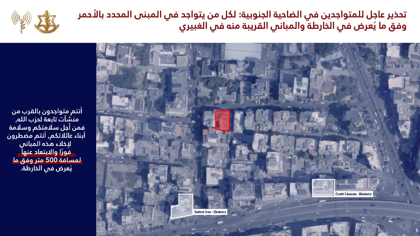 يذكر ان العدو الإسرائيلي قد هدد بضرب 10 مواقع في الضاحية الجنوبية وتحديدًا حارة حريك والحدث.