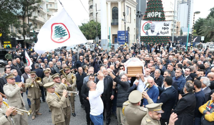 المحطة التالية كانت في ساحة ساسين، حيث كان في إنتظاره النائبان غسان حاصباني وجهاد بقرادوني والأمين العام لـ”القوات” إميل مكرزل وحشد من مسؤولي وجمهور “القوات”. بعدها رُفع النعش على الراحات وإنطلق المشاركون يتقدمهم “كشافة الحرية” على وقع إطلاق الألعاب النارية وعزف “موسيقى غوسطا” في مسيرة راجلة الى كنيسة “سيدة الانتقال” للروم الملكيين الكاثوليك-اتشيناك – الأشرفية.